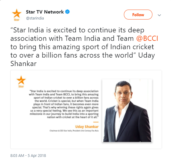 In a post on Star India’s Twitter handle, Uday Shankar, chairman and CEO – Star India & president 21st Century Fox, Asia, tweeted: “Star India is excited to continue its deep association with Team India and Team @BCCI to bring this amazing sport of Indian cricket to over a billion fans across the world.
