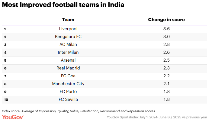 LIVERPOOL has been recognised as the fastest-improving football club in India, according to YouGov’s Sports on the Rise in 2025 (India) report, with its Index score climbing by +3.6 points.