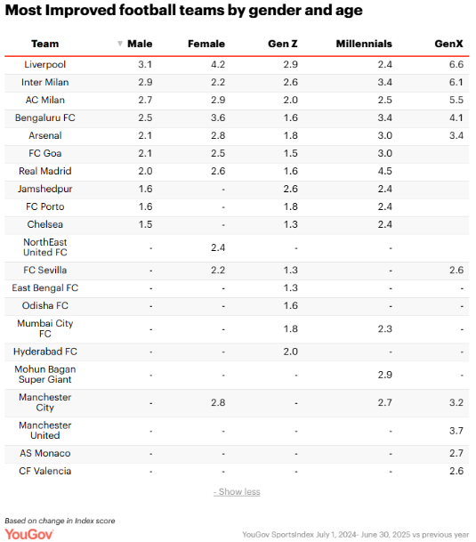 Liverpool’s surge comes on the back of a landmark Premier League title win, with the club registering notable gains across all demographics — men (+3.1), women (+4.2), Gen Z (+2.9), and Gen X (+6.6).